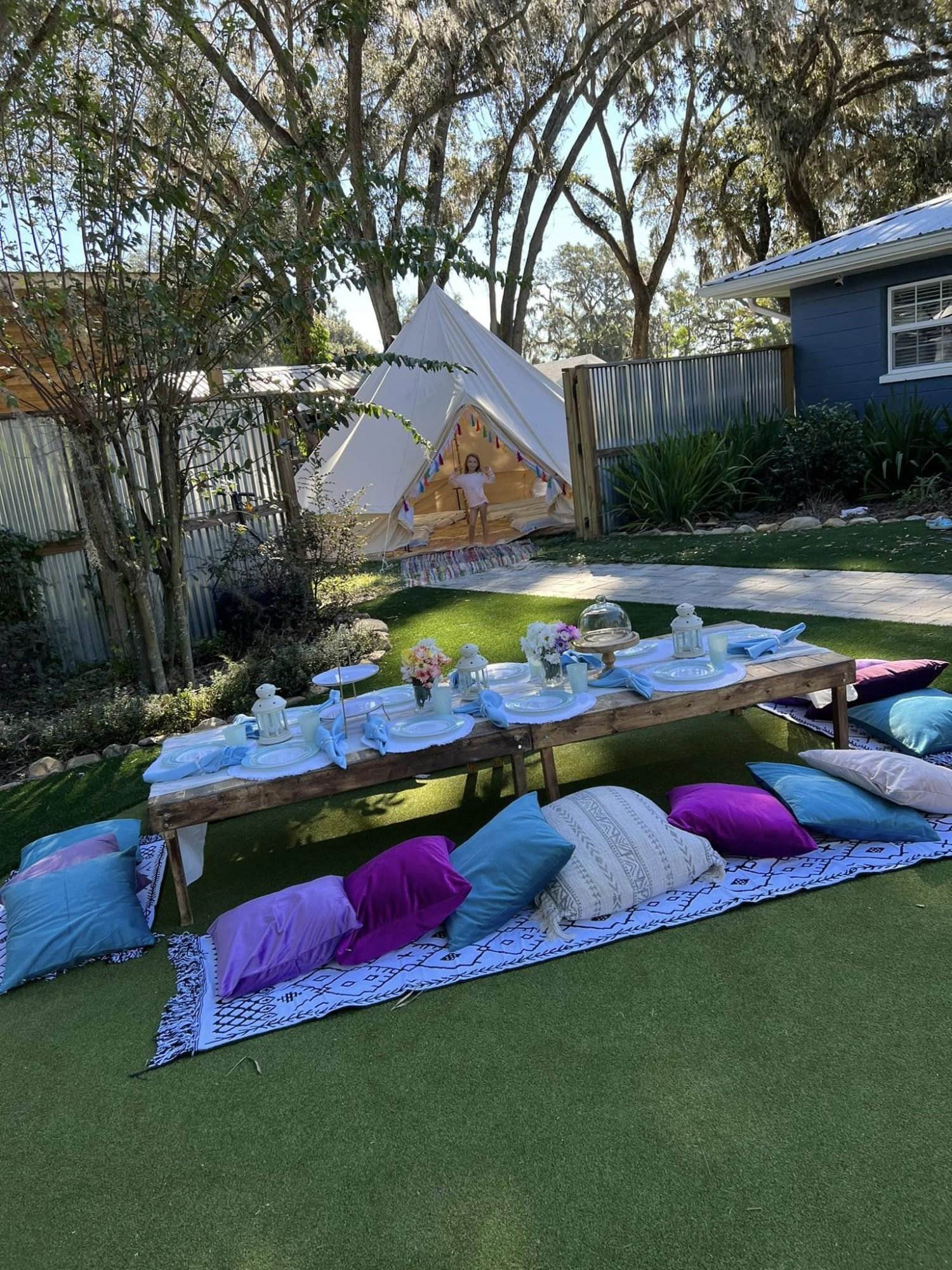 Transform your outdoor space and create an Instagram worthy picnic for your children! Our luxury picnic addon includes a custom picnic table, beautiful decorative chairs, silverware, plates, cups and unique décor to make your outdoor setup extra special. Enjoy a luxurious picnic in style with the Luxury Picnic Addon!
