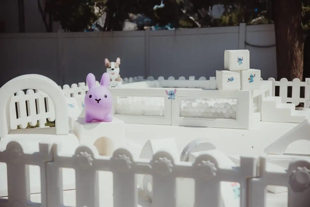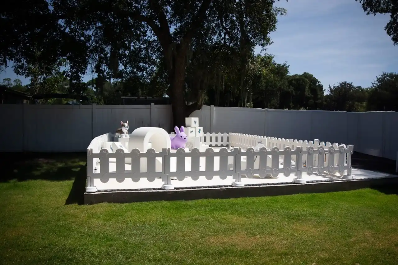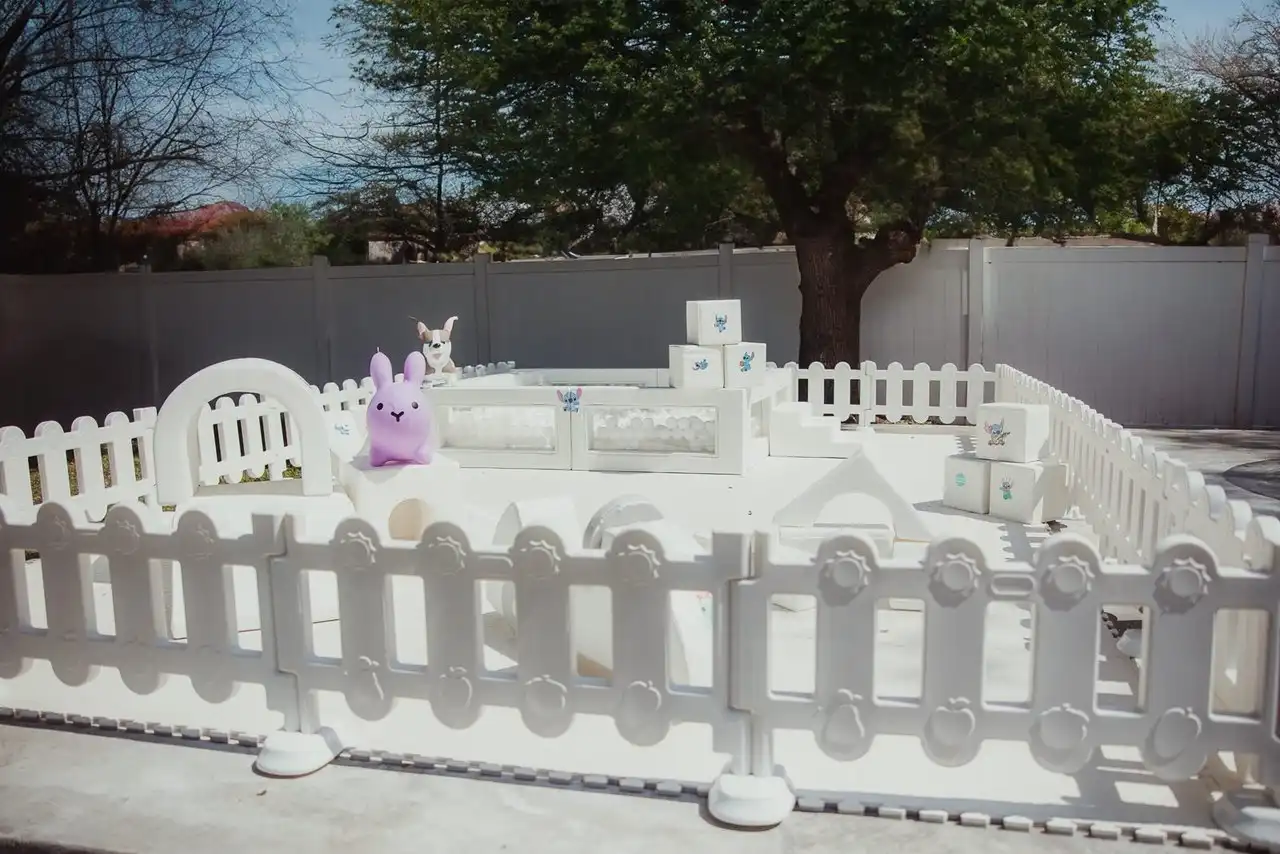- Fence and Gate: All white encloses the play area for safety and containment.